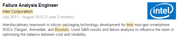 A search on LinkedIn revealed that there was not a single reference to a Morganfield platform and, indeed, the only three system-on-chip products associated with smartphones were to be Tangier, the SoC found in Merrifield, Anniedale, the SoC in Moorefield, and Broxton, as shown from this LinkedIn profile: