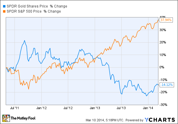 Since May 2011, SPDR Gold Trust (GLD +0.56%) is down 14% while the SPDR S&P 500 ETF is up 38%. Owning gold has not been a rewarding investment over this period as the U.S.10 year yield has risen and the U.S. economy has improved.