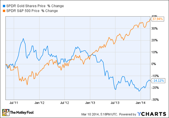 Since May 2011, SPDR Gold Trust (GLD 1.80%) is down 14% while the SPDR S&P 500 ETF is up 38%. Owning gold has not been a rewarding investment over this period as the U.S.10 year yield has risen and the U.S. economy has improved.