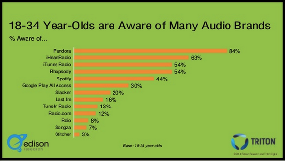 Still here? Okay, the point of all those numbers was that the 18-34 demographic is the key audience for streaming services. And a whopping 84% of that demographic were aware of Pandora's existence, compared to 44% for Spotify: