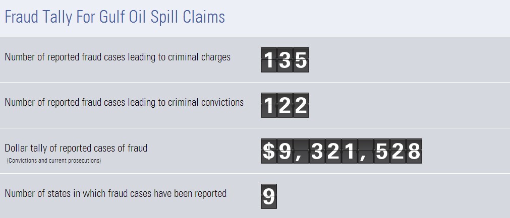 But if anyone should understand margin of errors, it's BP. Oil rigs carry risk, and so do claims. BP will never recover every drop of oil spilt into the Gulf of Mexico, and it shouldn't expect settlements to always flow smoothly. While the company claims there's half a billion bucks being distributed to the wrong awardees, the current actual tally (from BP's own website) puts fraudulent cases at much lower numbers.