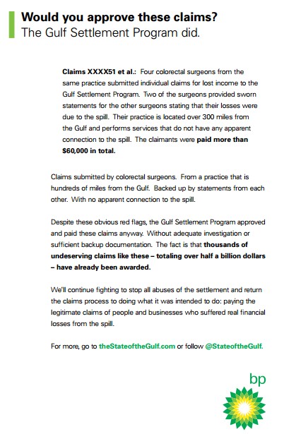 BP PLC is tired of being taken out to dry, and has launched a public campaign questioning the validity of claims against it. The company even took out full page ads in The Wall Street Journal, The New York Times, and the Washington Post , giving real-life examples of small business claims it views as fraudulent: