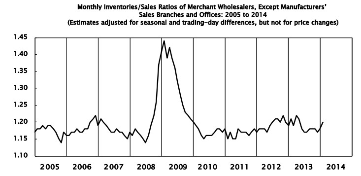 Year-over-year metrics indicate steadier balanced growth. Sales are up 3.9% from January 2013, while inventories have grown just 3.6%. The January 2013 sales-to-inventories ratio stood at a slightly higher 1.21.