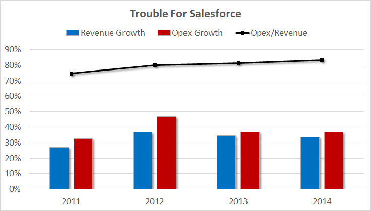 You could argue that Salesforce is investing in its future, and that recognizing its subscription-based revenue makes this sort of analysis tricky to begin with. But even ignoring the fact that operating expenses are growing relative to revenue, the fact that these costs are eating up more than 80% of revenue is troubling.
