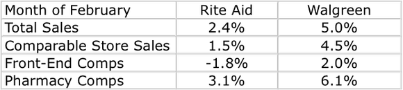 Now that Rite Aid reported February sales, we can understand how the company stacks up to larger rival Walgreen (WAG +0.00%). Walgreen's February comparable-store sales rose an impressive 4.5%. Unfortunately, investors weren't terribly happy with management's news and sent shares down 2.5% on the following day.