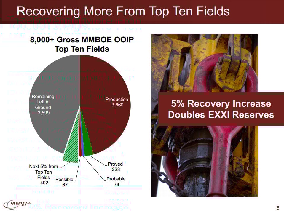 Once the deal is completed the combined business will produce about 65,000 barrels of oil equivalent per day, of which 70% of that production will be oil. However, this deal isn't so much about getting bigger. Instead, thanks to the use of new technology, including horizontal drilling, its about setting up Energy XXI for a future that will have it breathe new life into the acquired legacy oil fields. As the following slide shows there's still a lot of oil left in these fields so that just a 5% increase in the recovery factor would double the proved reserves of Energy XXI.
