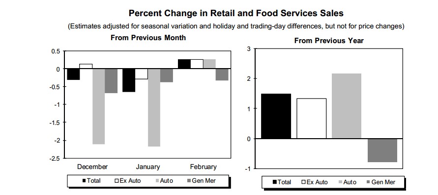 Retail and food services sales increased a seasonally adjusted 0.3% to $427 billion for February, according to a Commerce Department report (link opens as PDF) released today.