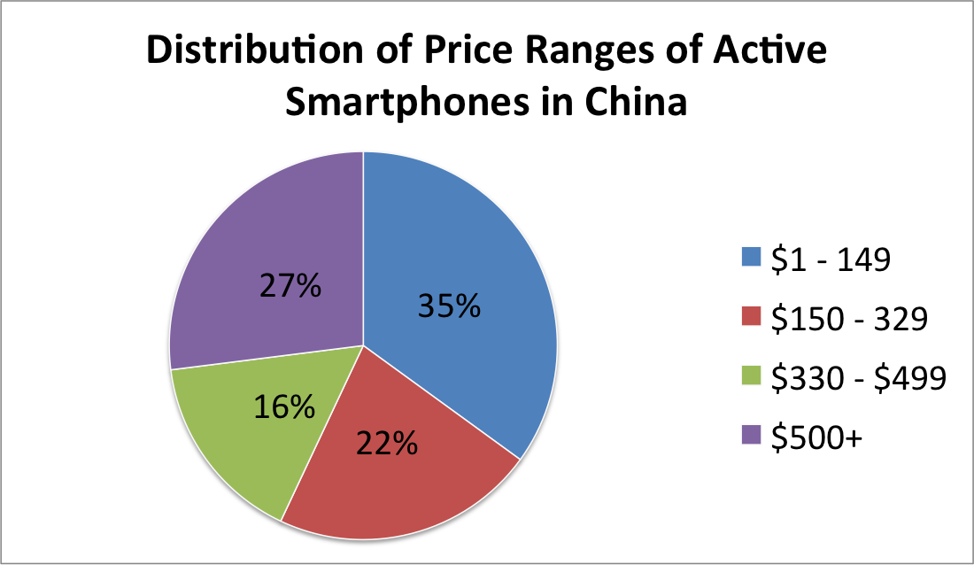 After the segment with smartphones prices between $1 and $149 -- a category that would be suicide for Apple to enter -- the $500 plus category is the largest segment of active smartphones in China. And 80% of these are iPhones, according to Umeng.