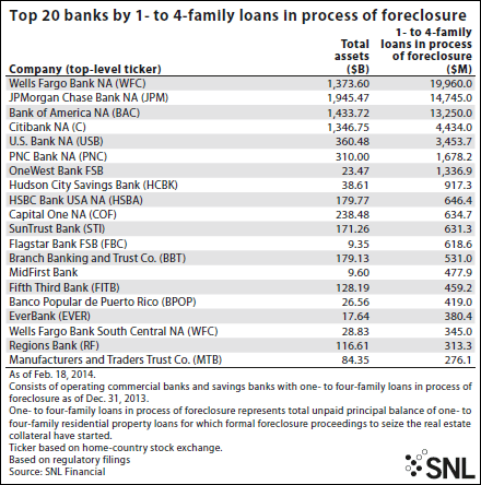 Recent data released by SNL Financial indicates that Wells Fargo has nearly $20 billion worth of one- to four-family home loans currently in the process of being foreclosed. While this represents less than 1.5% of the company's total assets, this is an astonishingly large number when considering that it only includes homes that are actively involved in foreclosure proceedings.