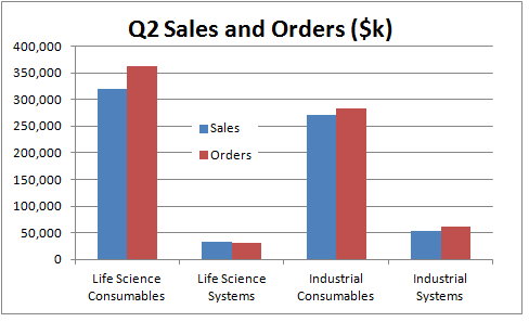 Clearly, the life science segment is outperforming, with total segment sales up 8.3% compared to 0.1% for the industrial segment. Moreover, a breakdown of the three individual components of each segment, demonstrates where the individual industry strengths and weaknesses are.