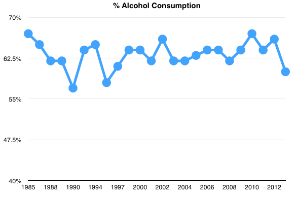 According to Gallup polls stretching back to the 1940s, the percentage of Americans consuming alcohol has never risen higher than 71%, nor dropped lower than 55%. Looking only at the past 20 years, the high for consumption was the 67% reached in 2010, while the low was 58%, hit in 1996. In other words, the majority of Americans consume alcohol and have for quite some time.