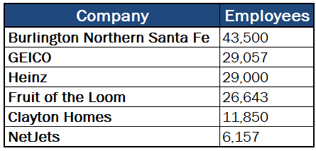 Yes, the company worth $310 billion only has 25 people employed in its corporate offices. But across its more than 80 operating businesses, it has an additional 330,720 employees, including a few major employers listed below: