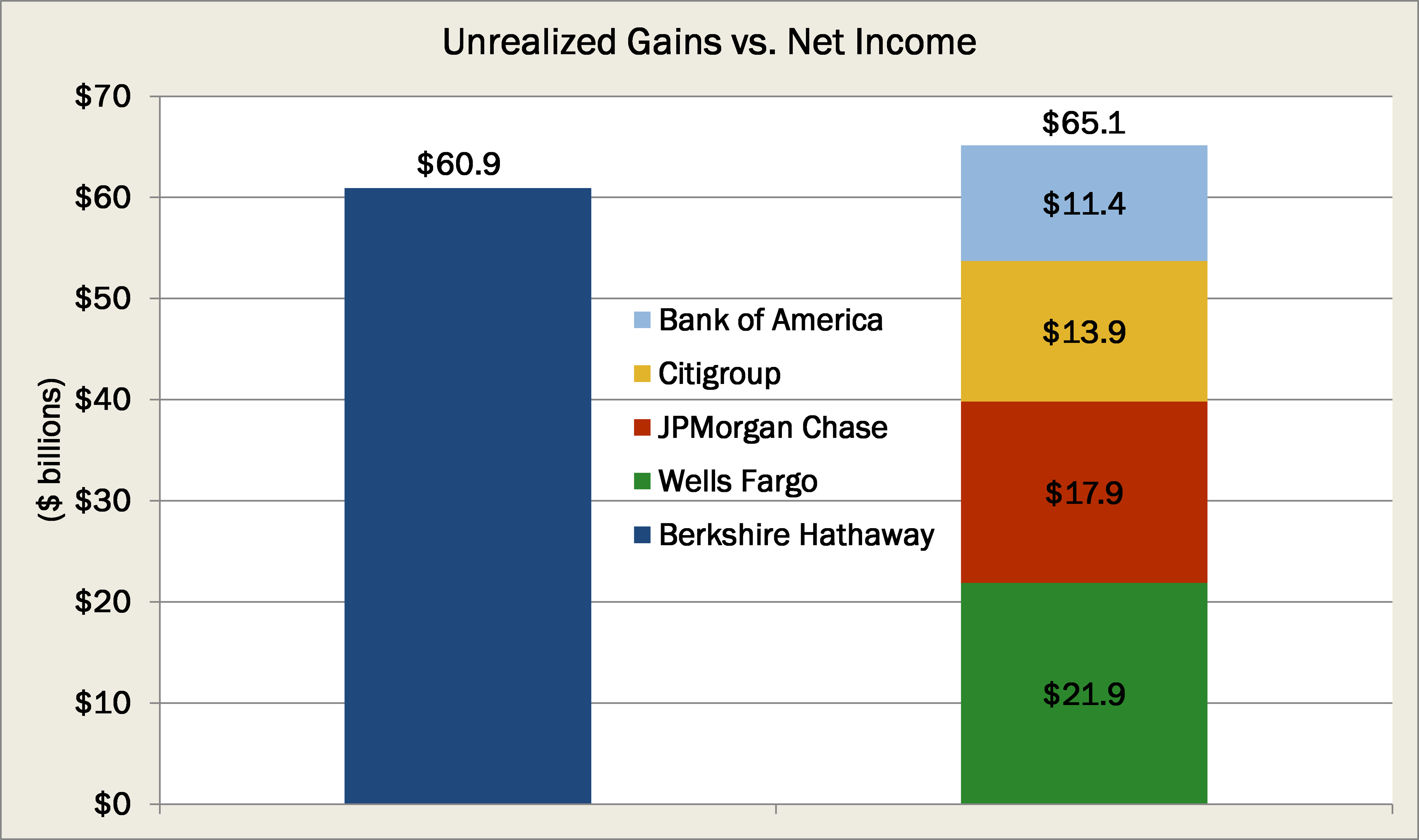 To put that in perspective, if Berkshire Hathaway decided to sell every stock it held on New Year's Eve 2013, it would've netted a return almost equal to what Wells Fargo, Bank of America, JPMorgan Chase, and Citigroup combined saw in net income last year: