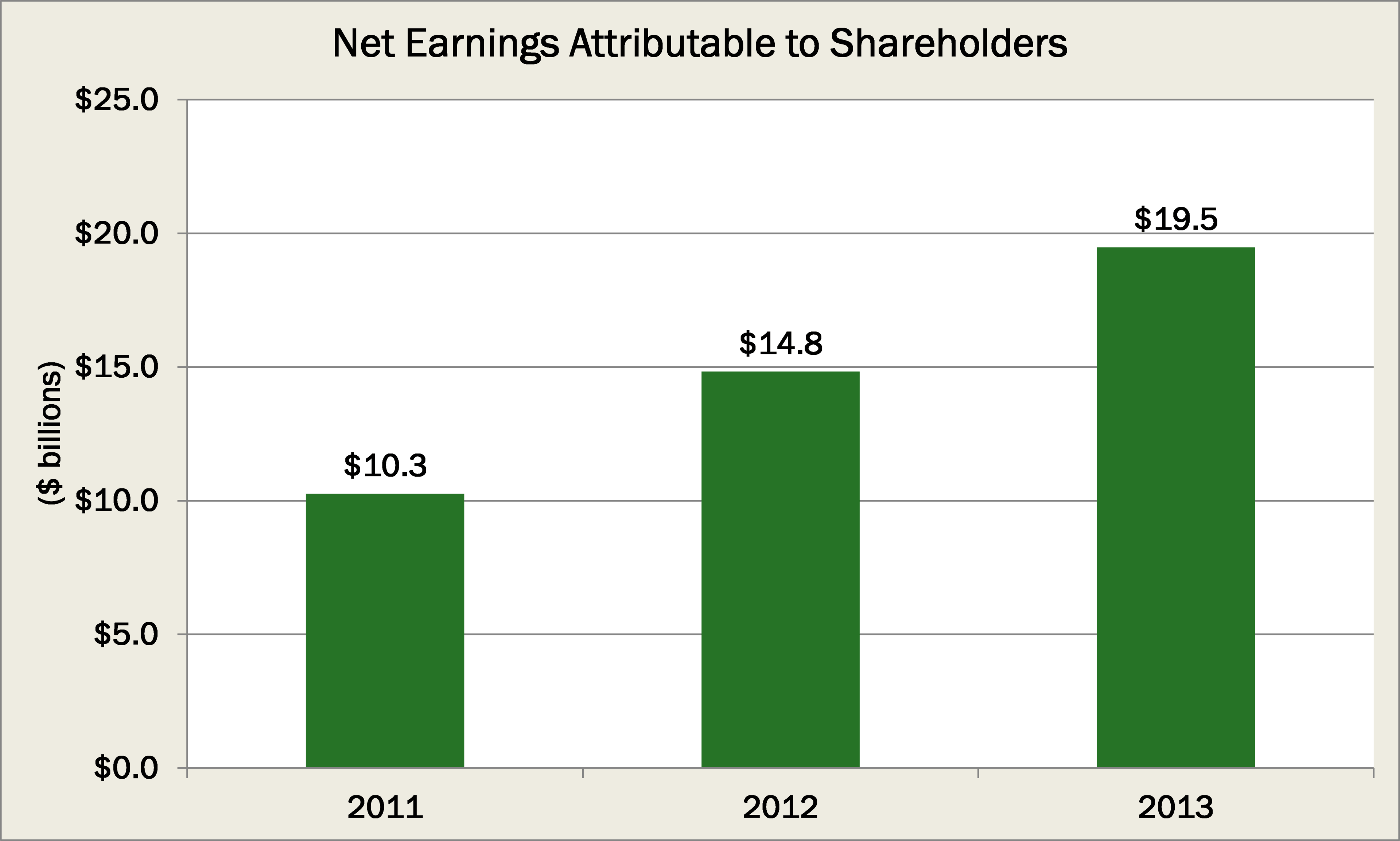 When reviewing Berkshire's results, Buffett noted plainly, "On the operating front, just about everything turned out well for us last year – in certain cases very well." A quick glance reveals the net income available to shareholders of Berkshire Hathaway rose by a staggering 32% in 2013, and its total of $19.5 billion almost doubled the $10.3 billion posted in 2011: