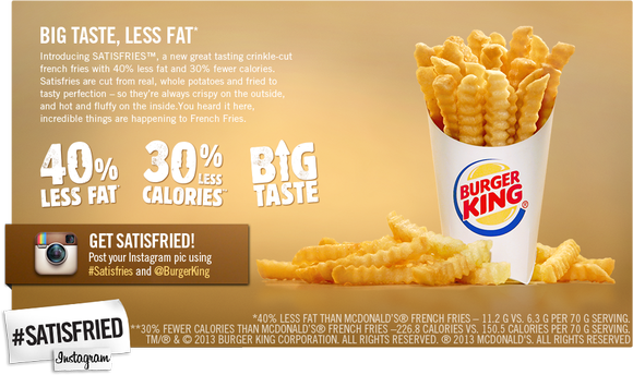 On March 4, Burger King announced that its Satisfries will now be the standard french fries with the Kid's Meal. Burger King says, "This reduced fat, reduced calorie menu item will provide children with a crinkle cut option that tastes so good, kids will never know they're lower-fat."