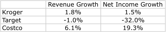 Another retailer that Kroger should be placed up against is Costco (COST +2.00%). Over the past year, the retailing giant that some investors dub the next Wal-Mart saw its revenue rise 6% from $99.1 billion to $105.2 billion. The primary driver behind this growth was a 6% rise in comparable-store sales, but the business also benefited from the openings of 26 new stores throughout the year.