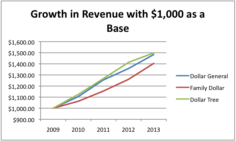 Where Family Dollar has fallen short, Dollar Tree Stores (DLTR +0.14%) has delivered. From 2009 through 2013, the company saw its revenue pop up 51% from $5.2 billion to $7.8 billion. While this isn't significantly greater than Dollar General's growth rate, it does show that management has been able to capitalize on its smaller size.