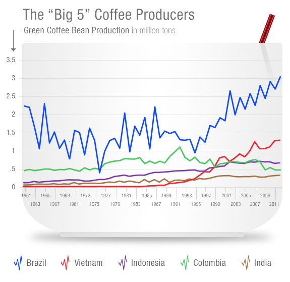 In fact, Brazil has been the biggest coffee producer for 50 of the 51 years data have collected by the Food and Agriculture Organization.