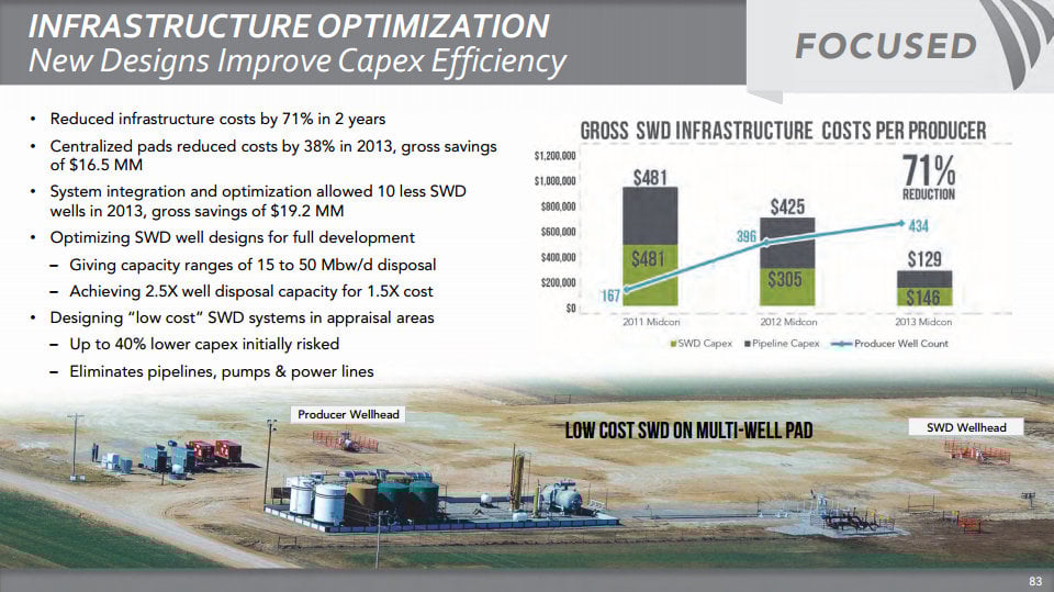 SandRidge Energy has spent a good part of the last year focusing its strategy solely on what it does best and that's develop its acreage in the Midcontinent. This is yielding really strong results as the company is drilling more wells for less money. For example, last year the company grew production 35% despite a 30% reduction in its rig count. In addition to that the company is improving the results of the wells it drills as it has seen an 8% improvement to its first year production. Another example of how focus is paying off is in its new lower cost saltwater disposal system, which is detailed in the following slide.