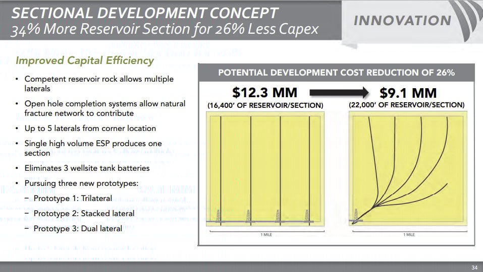 One of the reasons SandRidge Energy is able to get its costs down is because it's focused on using innovation to improve returns and add to its growth potential. This has included its appraisal program which recently added another 100,000 acres to its focused drilling program. In addition to that the company has added options to its playbook that enables it to develop its acreage in the most capital efficient manner. These options include three prototype projects that will enable it to drill the most effective wells. These could enable the company to tap 34% more of a reservoir section with 26% less capital as the following slide shows.