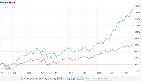 The chart below shows the Nasdaq Internet Index, a collection of about 80 of the largest and most liquid Internet-related stocks on the Nasdaq, NYSE and NYSE Amex. Take a look at the Index's return compared to the S&P 500 since 2010.