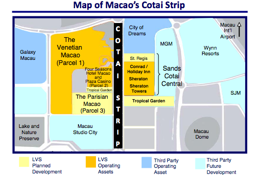 The main area in Macau spurring new growth and profits is the Cotai strip, an area that is already becoming dominated by Sands holdings. Other companies, including Melco Crown (MPEL +1.83%) and Wynn Resorts (WYNN +5.66%) also plan development in the area. The area has seen near-constant development as casino companies build bigger and better resorts, most of which will open in the next year or two. The two casinos on the strip owned by Sands, The Venetian Macao and the Sands Cotai Central, have already posted solid growth and revenue. Sands Cotai Central for example reported a 61% jump in revenue and a more than 250% surge in operating income for 2013.
