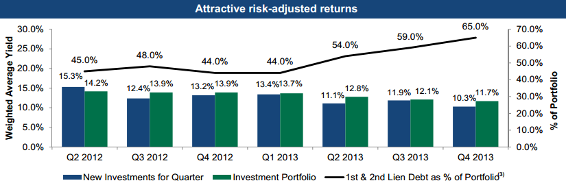 In the past two years, the company has moved to "safer" first-lien securities, driving down its investment yields. THL Credit's portfolio yielded as much as 14.2% in 2012, and since then, the portfolio's yield has plummeted to 11.7%.
