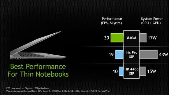The 840M, one of NVIDIA's new lower-end GPUs, provides triple the performance of Intel's HD 4400 integrated graphics. That's not surprising; but what is surprising is the power consumption. While the integrated system uses 15 watts of power, the discrete system uses just 13% more power at 17 watts. This 200% performance gain for a 13% increase in power consumption shows the real benefit of the Maxwell architecture. Oddly, Intel's higher-end Iris Pro integrated graphics uses a staggering 43 watts of power, and still can't match NVIDIA's performance.