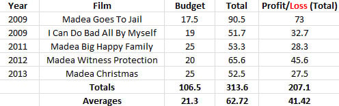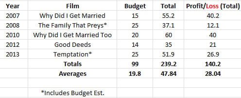 His films away from Madea are harder to extrapolate from, given that the budgets aren't as readily available, but we can assume they were made for around his usual $25 million budget.