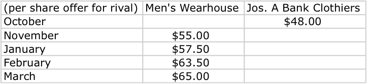 In November, Men's Wearhouse first offered to buy Jos. A Bank for $55 per share. This offer, followed by subsequent offers by the company, helped push shares of the smaller retailer up nearly 56% since October. That was when Men's Wearhouse refused Jos. A. Bank's bid to acquire its larger rival for $48 per share.