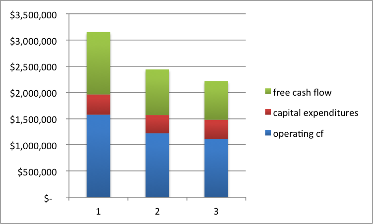 Staples ability to maintain free cash flow is vital to continue it's dividend and share buyback program. The most common way to calculate free cash flow is subtracting capital expenditures from operating cash flow. Staples operating cash flow, which is generated by selling it's products, has experienced a downtrend recently with $1.5 billion, $1.2 billion, and $1.1 billion in 2011, 2012, and 2013 respectively.