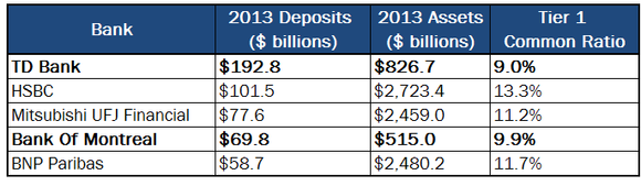 Although the banks mentioned earlier have a significant presence in the less risky retail banking landscape, they too will be subject to these heightened regulations. And while it is still many months away, Bank of Montreal and TD Bank fall well behind the others from a capital standpoint: