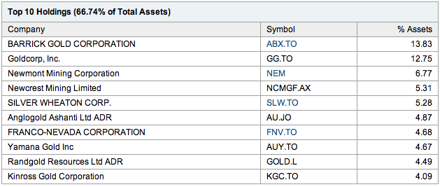 For an investor looking to primarily bet on gold prices, it may make more sense to make a broader bet and invest in an ETF that owns shares in all the gold mining companies rather than trying to pick and choose between them. One ETF that does this is the Market Vectors Gold Miners ETF (GDX +4.82%). This ETF owns shares in the largest gold mining companies in the world, weighted by market cap.