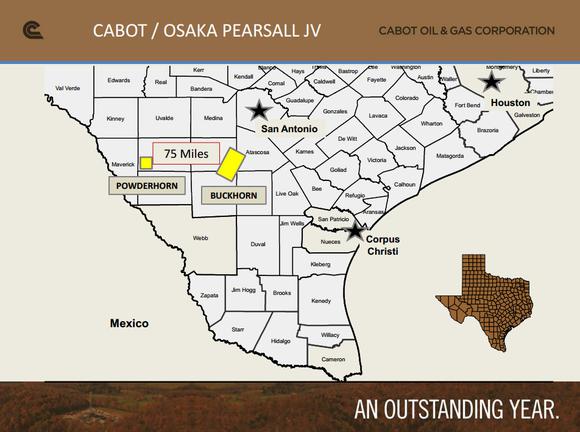 Closer to the Mexican border and below the Eagle Ford Shale lies the Pearsall Shale. A number of companies including Cabot Oil & Gas (COG +1.93%) are working to develop the Pearsall Shale. Cabot is working on this deeper shale formation as part of a joint venture it signed in 2012 with Osaka Gas Co. The following slide details a map of the company's Pearsall JV acreage.