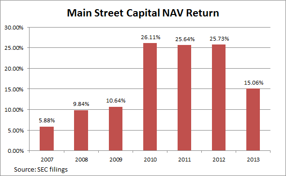 What we really want to find is the returns underlying the share price. Main Street Capital is nothing more than a closed-end investment fund. The performance of its investments, not the movements of its share price, is more important to understanding whether or not Main Street is truly outperforming other BDCs.