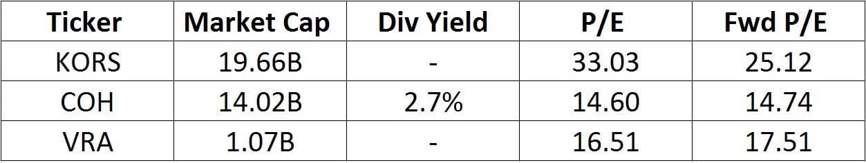 The company needs to reinvigorate performance in the U.S., and management is betting on a refreshed collection from incoming creative director Stuart Vevers to achieve that goal. In any case, the stock trades at materially cheaper levels than Micheal Kors and Vera Bradley when looking at ratios like P/E and forward P/E.