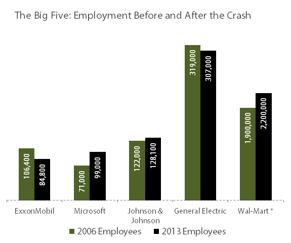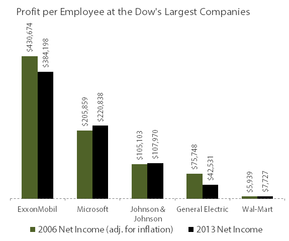 This divergence can be seen in corporate earnings reports as well. I pulled the annual filings of the five largest Dow Jones Industrial Average (^DJI 0.31%) components by market cap from 2006 and from 2013. Two of the five trimmed their employment rolls from 2006 to 2013, and those same two companies suffered a decline in profit from pre-crisis levels to their most recently ended fiscal year. However, only one suffered a drop in profit per employee, and this discrepancy is easily explained. More on that after the graphs: