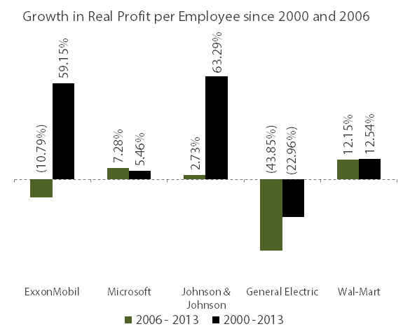 This is pretty startling when you think about it, and it appears even more extreme than the change seen at the very top of the corporate pyramid. When we look further back at our Big Five, every company except GE still winds up with a gain in real profit per employee. Surprisingly, it's Microsoft (MSFT +1.65%) that experiences the smallest percentage gain from the turn of the century to the present day, as each member of its 99,000-strong workforce produced only 5.5% more profit in real terms than each of their 47,600 contemporaries earned 13 years earlier. GE continues to struggle to recapture its turn of the century highs, but it appears to be the odd company out here: