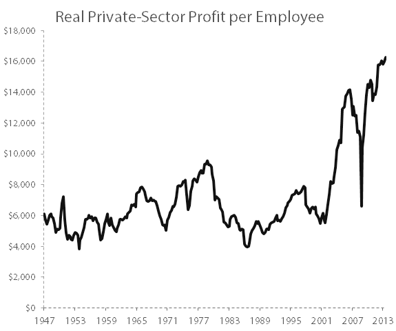 Postwar profit per employee remained relatively stable until the turn of the 21st century, when each employee suddenly became much more profitable. Today, the average private-sector worker produces nearly 200% more profit in real terms than he did in fall 2000. Even if we cherry pick the absolute highest points of per-employee profit during the latter half of the 20th century, we find that the average employee is still twice as profitable today as his or her counterpart in 1997, and 70% more profitable than an earlier counterpart was in 1978.