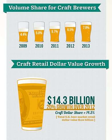 Although some analysts contend drinkers are suffering from craft beer fatigue, the just-released numbers from the Brewers Association seems to belie the sentiment that they're tapped out, as craft beer volumes rose 18% in 2013, hitting 15.6 million barrels, while their retail dollar value rose 20% year over year to more than $14 billion. The niche now represents 7.8% of the total U.S. beer market, its highest level ever.