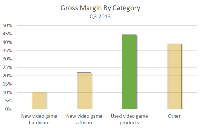 In the third quarter, slightly less than 25% of GameStop's revenue was derived from pre-owned video game products. However, this category carries the highest gross margin for the company, more than double that of new video games and quadruple that of new video game hardware. The gross margin for pre-owned games is even higher than the "other" category, which includes digital downloads and mobile revenue. In other words, pre-owned games are GameStop's cash cow.
