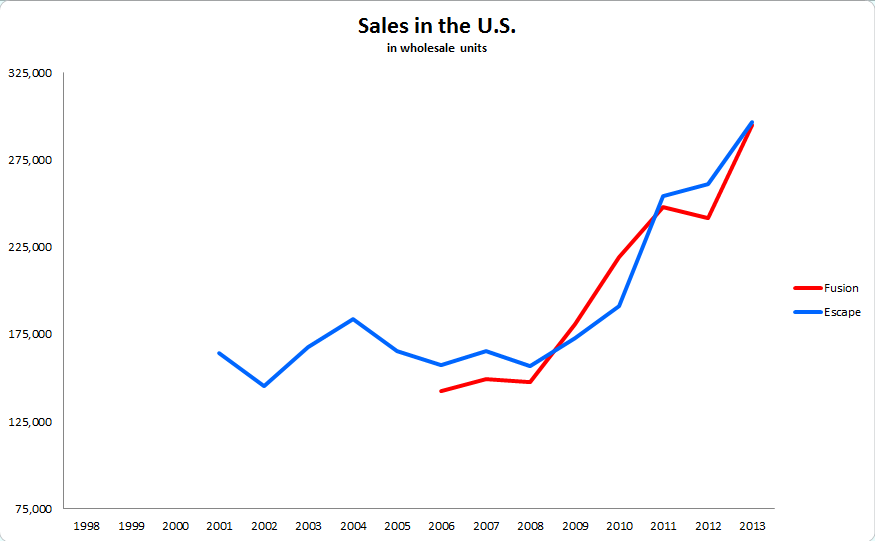 Consider that Ford's three best-selling vehicles in the U.S. are the F-Series, Fusion, and Escape, and each boast an EcoBoost take rate of 42%, 52%, and a whopping 89%, respectively. Ford's EcoBoost engine options have proved very popular with its consumers in many different models and have played a large role in sending sales of the Fusion and Escape soaring after they remained flat before and during the recession.