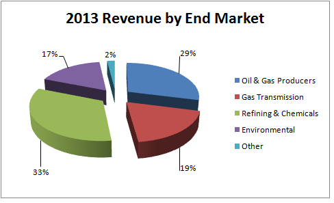 Simply put, the trend within the upstream oil and gas market (Dresser-Rand generated 98% of its revenue from energy infrastructure in 2013) is for relatively stronger conditions in emerging markets than the U.S. A breakout of its 2013 revenue by end market reveals how important oil and gas production and refining is to the company.