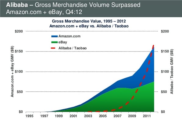 Thanks to the massive success of Taobao, in the fourth quarter of 2012, the gross merchandise of Alibaba surpassed the combined volume of Amazon.com and eBay. Moreover, although other competitors have started to focus on "swift guanxi" as well, Taobao now enjoys enormous enormous scale advantages and network effects, as it has become a gigantic bazaar with roughly 760 million products.