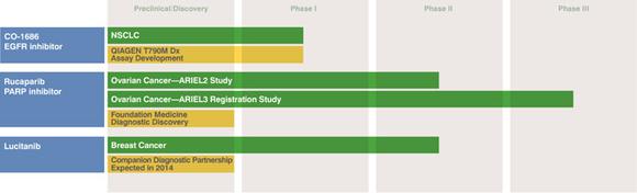 Clovis is developing three oncology drugs and companion diagnostic products for a total of five indications. The company's most advanced clinical candidate is rucaparib, which is currently in a late-stage trial for ovarian cancer. If successful, Clovis plans on filing a New Drug Application for rucaparib in 2015. Next in line is CO-1686, indicated as a potential treatment for non-small cell lung cancer, or NSCLC. During the company's latest conference call, CEO Patrick Mahaffy said that the company is "aggressively moving forward with [its] plan to initiate registration studies for CO-1686 in the second quarter."