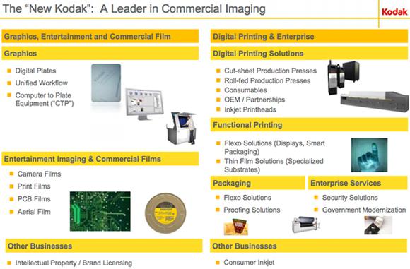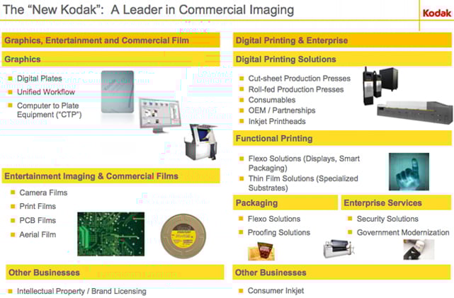The new Kodak plans to focus on commercial imaging and graphics, together with providing digital printing solutions to businesses. In the past few quarters, the company exited, divested, or harvested most of its non-core businesses and assets. This allowed the company to eliminate various legacy liabilities, including losses related to Kodak Gallery, which was once the company's consumer online digital photography website and served more than 60 million users at its peak.