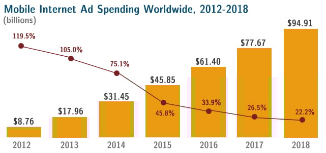 Mobile advertising is booming. According to research company eMarketer, the market for mobile advertising doubled in 2013 to $17.9 billion, representing a 105% increase, year over year. More important, the same source expects this market to grow another 75% in 2014, to more than $34 billion. By 2018, this market is expected to reach $94.91 billion, roughly five times its current size.