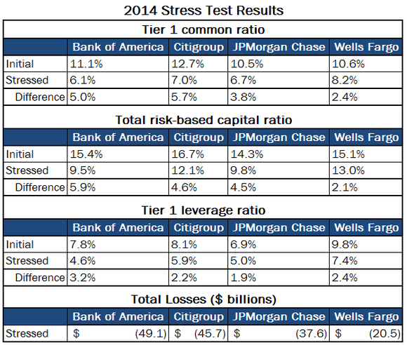 Unsurprisingly, Wells Fargo comes out on top relative to the big four in every major category gauged in both the size of the drop seen from the initial standing to the stressed standing, and final result. It has higher capital and leverage ratios -- which measure its ability to insulate against risk -- and also has dramatically lower bottom-line losses: