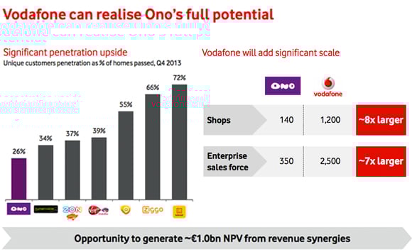 But, Ono is not only big, it is also one of the most modern networks in Europe. The company started building its next-generation network in 1998 and has, so far, invested roughly $9.6 billion in developing a future-proof network covering 41% of Spanish homes. Ono's scale and technological advantages should allow Vodafone to benefit from various cross-selling and up-selling opportunities.