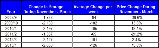 Here's a look at the change in natural gas total storage and prices between November and March of the past several years.